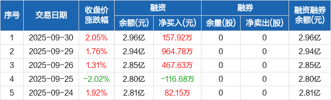 融资方面,当日融资买入3422.46万元,融资偿还3264.54万元,融资净买入157.92万元,连续3日净买入累计1590.33万元。融券方面,融券卖出0股,融券偿还0股,融券余量0股,融券余额0元。融资融券余额合计2.96亿元。