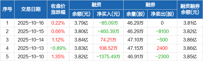融资方面,当日融资买入1772.47万元,融资偿还1857.55万元,融资净偿还85.09万元。融券方面,融券卖出0股,融券偿还0股,融券余量46.29万股,融券余额211.08万元。融资融券余额合计3.81亿元。