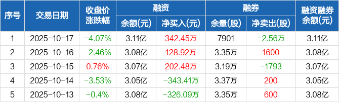 振华新材融资融券信息显示,2025年10月17日融资净买入342.45万元;融资余额3.11亿元,较前一日增加1.11%。