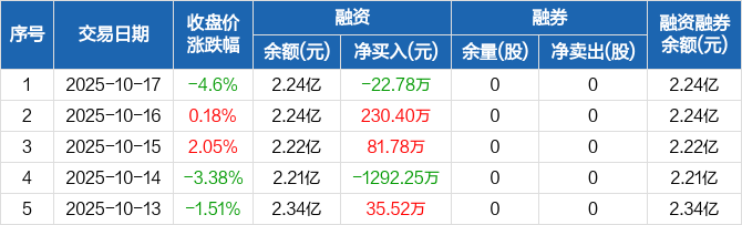 融资方面,当日融资买入897.95万元,融资偿还920.73万元,融资净偿还22.78万元。融券方面,融券卖出0股,融券偿还0股,融券余量0股,融券余额0元。融资融券余额合计2.24亿元。