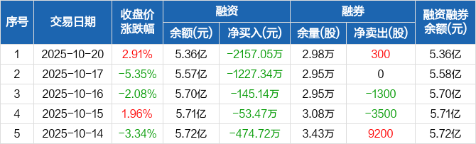 融资方面,当日融资买入1417.07万元,融资偿还3574.12万元,融资净偿还2157.05万元,连续5日净偿还累计4057.73万元。融券方面,融券卖出300股,融券偿还0股,融券余量2.98万股,融券余额36.92万元。融资融券余额合计5.36亿元。