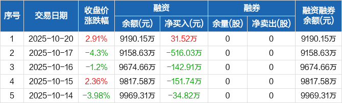 融资方面,当日融资买入498.31万元,融资偿还466.79万元,融资净买入31.52万元。融券方面,融券卖出0股,融券偿还0股,融券余量0股,融券余额0元。融资融券余额合计9190.15万元。