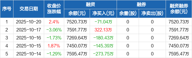 融资方面,当日融资买入450.66万元,融资偿还521.69万元,融资净偿还71.04万元。融券方面,融券卖出0股,融券偿还0股,融券余量0股,融券余额0元。融资融券余额合计7520.73万元。
