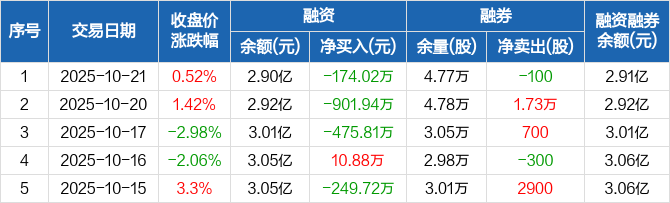 融资方面,当日融资买入555.53万元,融资偿还729.55万元,融资净偿还174.02万元,连续3日净偿还累计1551.77万元。融券方面,融券卖出0股,融券偿还100股,融券余量4.77万股,融券余额65.02万元。融资融券余额合计2.91亿元。