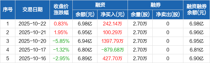 融资方面,当日融资买入2254.46万元,融资偿还2012.32万元,融资净买入242.14万元,连续3日净买入累计1740.23万元。融券方面,融券卖出0股,融券偿还0股,融券余量2.7万股,融券余额52.68万元。融资融券余额合计6.98亿元。