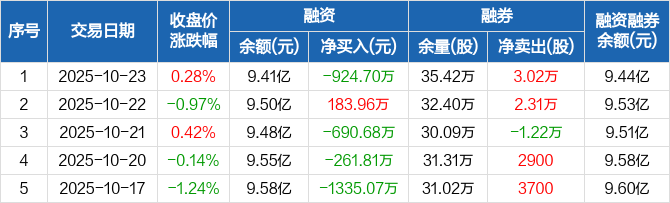 华峰超纤融资融券信息显示,2025年10月23日融资净偿还924.7万元;融资余额9.41亿元,较前一日下降0.97%。