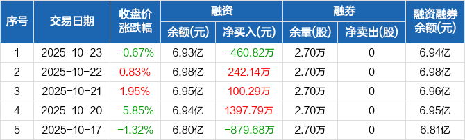 融资方面,当日融资买入1352.21万元,融资偿还1813.03万元,融资净偿还460.82万元。融券方面,融券卖出0股,融券偿还0股,融券余量2.7万股,融券余额52.33万元。融资融券余额合计6.94亿元。