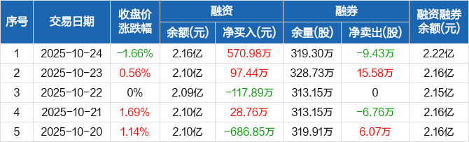 融资方面,当日融资买入3387.17万元,融资偿还2816.19万元,融资净买入570.98万元。融券方面,融券卖出2.25万股,融券偿还11.68万股,融券余量319.3万股,融券余额568.35万元。融资融券余额合计2.22亿元。