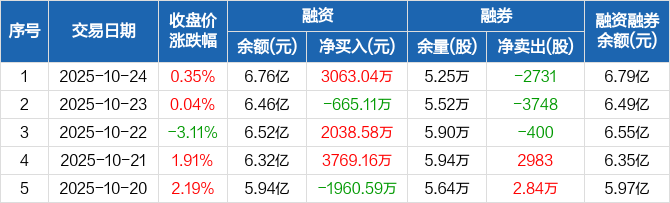 融资方面,当日融资买入7515.57万元,融资偿还4452.53万元,融资净买入3063.04万元。融券方面,融券卖出0股,融券偿还2731股,融券余量5.25万股,融券余额288.89万元。融资融券余额合计6.79亿元。