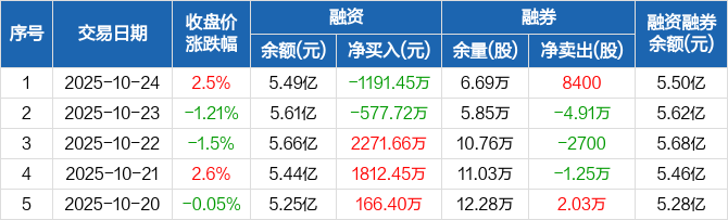 融资方面,当日融资买入6913.82万元,融资偿还8105.27万元,融资净偿还1191.45万元。融券方面,融券卖出1.09万股,融券偿还2500股,融券余量6.69万股,融券余额128.98万元。融资融券余额合计5.5亿元。