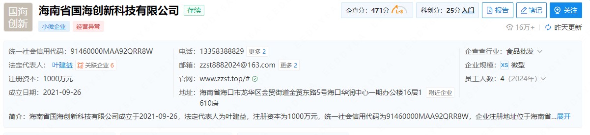 企查查显示,国海创新成立于2021年9月26日,注册资本1000万元,2022~2023年的社保缴纳人数为0,2024年为4人。值得注意的是,该公司于今年9月22日被列为经营异常状态,异常原因为:通过登记的住所或者经营场所无法联系。