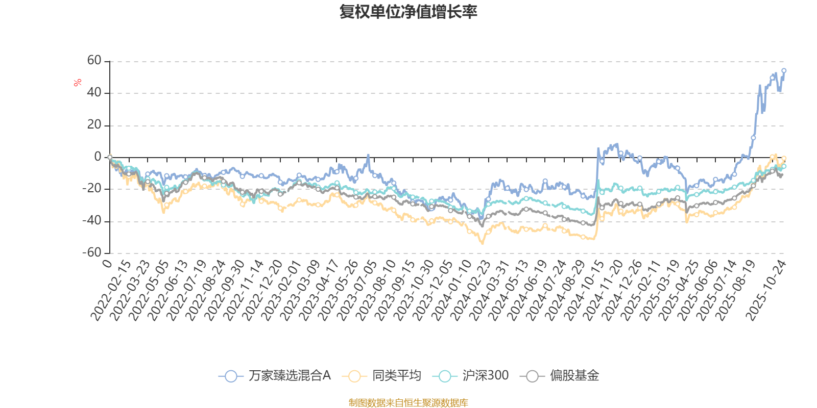 截至10月24日,万家臻选混合A近三个月复权单位净值增长率为58.66%,位于同类可比基金23/229;近半年复权单位净值增长率为88.28%,位于同类可比基金25/229;近一年复权单位净值增长率为50.66%,位于同类可比基金114/213;近三年复权单位净值增长率为72.12%,位于同类可比基金37/158。