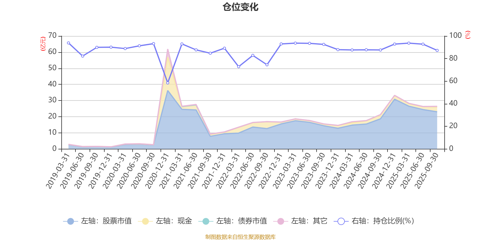 据定期报告数据统计,近三年平均股票仓位为90.86%,同类平均为86.72%。2019年一季度末基金达到93.87%的最高仓位,2020年末最低,为58.49%。