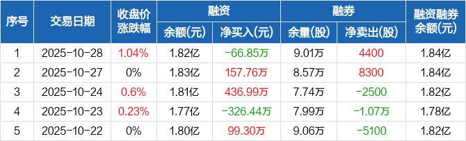 融资方面,当日融资买入489.75万元,融资偿还556.59万元,融资净偿还66.85万元。融券方面,融券卖出4800股,融券偿还400股,融券余量9.01万股,融券余额122.18万元。融资融券余额合计1.84亿元。