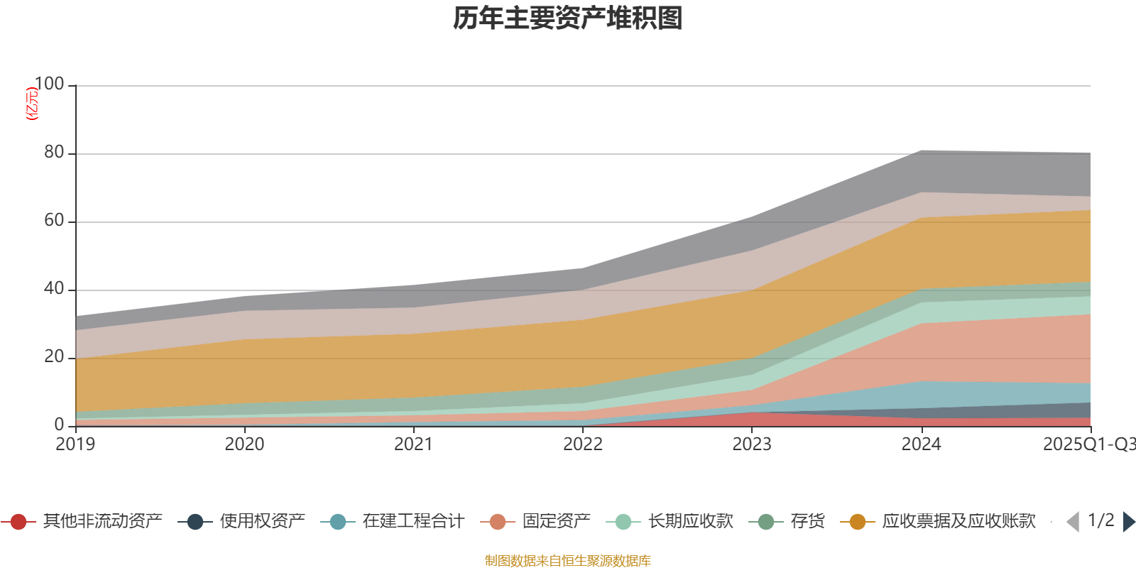 资产重大变化方面,截至2025年三季度末,公司固定资产较上年末增加19.15%,占公司总资产比重上升4.24个百分点;货币资金较上年末减少46.4%,占公司总资产比重下降4.21个百分点;在建工程合计较上年末减少28.74%,占公司总资产比重下降2.76个百分点;使用权资产较上年末增加52.33%,占公司总资产比重上升1.95个百分点。