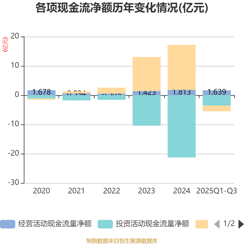 2025年前三季度,公司经营活动现金流净额为1.64亿元,同比增加4.41亿元;筹资活动现金流净额-1.96亿元,同比减少16.38亿元;投资活动现金流净额-3.55亿元,上年同期为-19.58亿元。