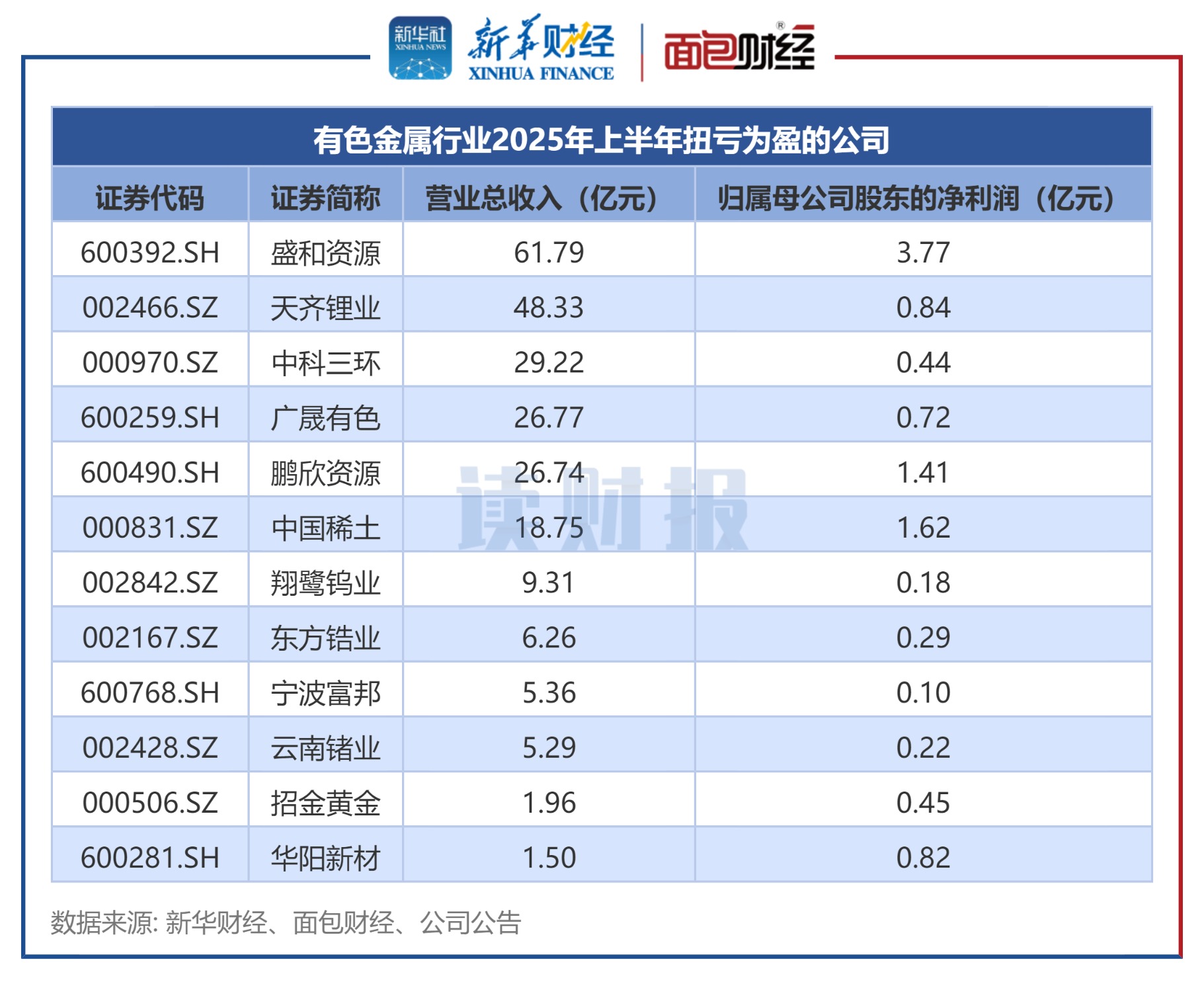 盛和资源、天齐锂业等十余家有色金属企业实现扭亏为盈。天齐锂业称,2025年上半年公司锂产品销售价格较上年同期下降,但得益于公司控股子公司文菲尔德锂矿定价周期缩短,其全资子公司泰利森化学级锂精矿定价机制与公司锂化工产品销售定价机制在以前年度存在的时间周期错配的影响已大幅减弱。
