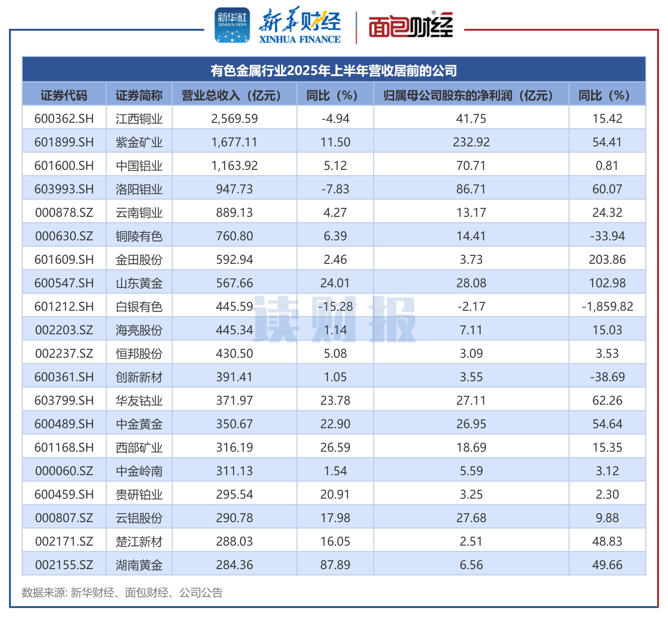 江西铜业、紫金矿业、中国铝业上半年营业收入分别达到2569.59亿元、1677.11亿元、1163.92亿元,均超千亿元。