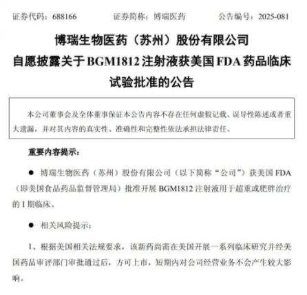9月29日,袁建栋实控的博瑞医药披露,BGM1812注射液,获美国FDA批准,开展超重或肥胖治疗的I期临床。