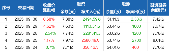 融资方面,当日融资买入1.15亿元,融资偿还1.4亿元,融资净偿还2494.59万元,连续3日净偿还累计5889.33万元。融券方面,融券卖出200股,融券偿还2.35万股,融券余量51.11万股,融券余额454.88万元。融资融券余额合计7.42亿元。