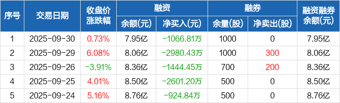 融资方面,当日融资买入6444.04万元,融资偿还7510.86万元,融资净偿还1066.81万元,连续6日净偿还累计9143.47万元。融券方面,融券卖出0股,融券偿还0股,融券余量1000股,融券余额1.65万元。融资融券余额合计7.95亿元。