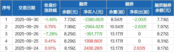 融资方面,当日融资买入7324.33万元,融资偿还9704.99万元,融资净偿还2380.66万元,连续3日净偿还累计5737.06万元。融券方面,融券卖出0股,融券偿还2万股,融券余量8.54万股,融券余额96.16万元。融资融券余额合计7.73亿元。
