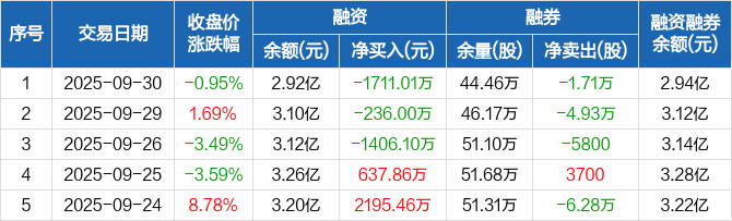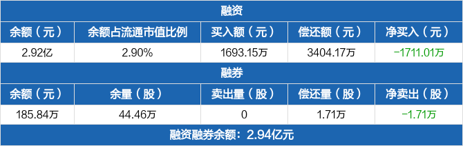 融资方面,当日融资买入1693.15万元,融资偿还3404.17万元,融资净偿还1711.01万元,连续3日净偿还累计3353.12万元。融券方面,融券卖出0股,融券偿还1.71万股,融券余量44.46万股,融券余额185.84万元。融资融券余额合计2.94亿元。