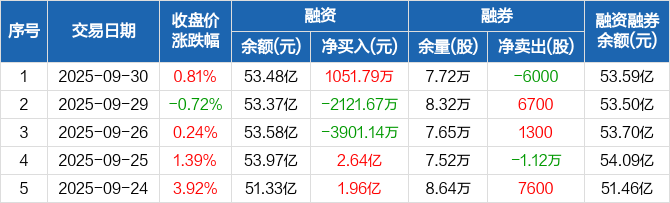 融资方面,当日融资买入6.15亿元,融资偿还6.04亿元,融资净买入1051.79万元。融券方面,融券卖出8800股,融券偿还1.48万股,融券余量7.72万股,融券余额1166.5万元。融资融券余额合计53.59亿元。