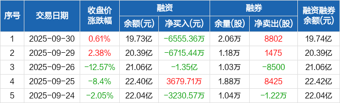 融资方面,当日融资买入1.02亿元,融资偿还1.68亿元,融资净偿还6555.36万元,连续3日净偿还累计2.67亿元。融券方面,融券卖出1.08万股,融券偿还2000股,融券余量2.06万股,融券余额123.2万元。融资融券余额合计19.74亿元。