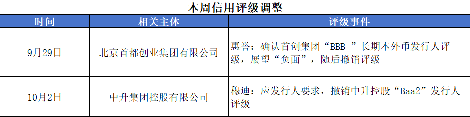 本周中资美元债收益率小幅上涨。截至北京时间10月3日18时,Markit iBoxx中资美元债综合指数上涨0.29%,报249.92;投资级美元债指数周度上涨0.33%,报242.29;高收益美元债指数周度上涨0.05%,报245.67。本周,地产美元债指数周度上涨0.06%,报186.95;城投美元债指数周度上涨0.18%,报152.24;金融美元债指数周度上涨0.19%,报289.69。