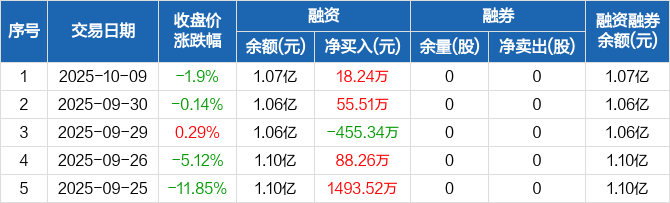 万德斯融资融券信息显示,2025年10月9日融资净买入18.24万元;融资余额1.07亿元,较前一日增加0.17%。