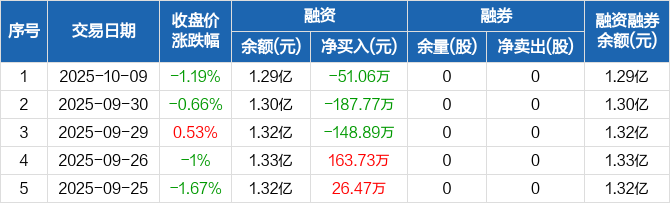 融资方面,当日融资买入672.7万元,融资偿还723.77万元,融资净偿还51.06万元,连续3日净偿还累计387.73万元。融券方面,融券卖出0股,融券偿还0股,融券余量0股,融券余额0元。融资融券余额合计1.29亿元。