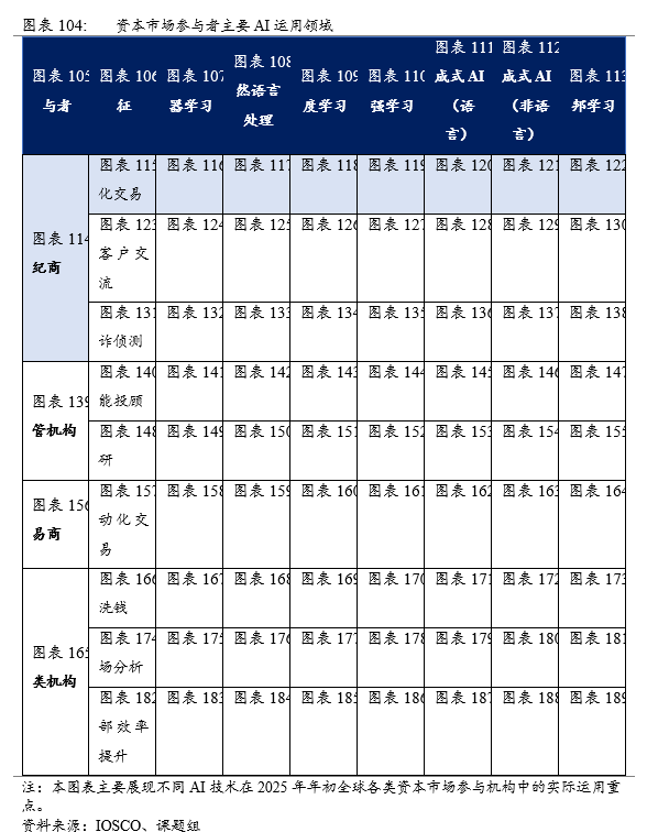 在智能投顾和投研领域运用AI的基础上,全球各经济体的资管机构也在考虑或测试部分AI的运用,虽然这些AI运用暂未部署至生产领域,但是随着未来AI技术的升级,相关AI或也能够投入生产环境。具体来看,相关运用主要包括以下几个方面: