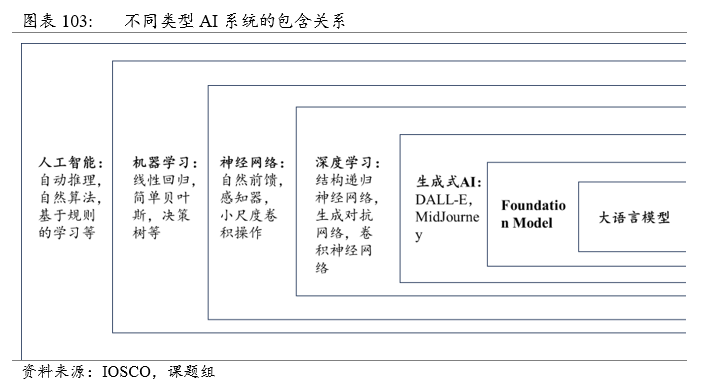 2025年3月,国际证监会组织(IOSCO)发布了《资本市场中的AI运用:案例、风险和挑战》(Artificial Intelligence in Capital Markets: Use Cases, Risks, and Challenges)报告 。根据该报告定义,AI系统(AI system)指的是一种机器系统(machine-based system)。该系统能够根据显性或隐性的目标,基于其所接受的输入信息,自动输出可以影响实体或虚拟环境的预测、建议、决策等内容。而不同的AI系统将会在自动化程度(Level of autonomy)和部署之后的适应性(Adaptiveness)方面存在一定的差异。根据该报告的的定义,从最广义的AI系统角度来看,其包括自动推理、自然算法等内容,不过近年来热度相对较高的人工智能运用集中在生成式AI以及大语言模型领域。