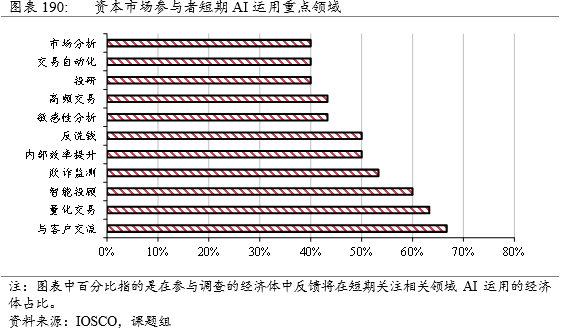 该报告的调研群体主要包括IOSCO金融科技工作组(Fintech Task Force, FTF)的24个参与经济体。在该报告中,IOSCO通过对各个经济体资本市场中监管者进行调查问卷,详细梳理了全球各个资本市场中参与者对于AI的运用重点。根据调查问卷结果,IOSCO发现,对于主要经济体内参与资本市场各项业务的资管机构而言,目前对于AI的运用集中在智能投顾(Robo-Advice)和投资研究(Investment Research)。若进一步将范围拓展到资本市场的各类参与者,可以发现资本市场各类参与者最为普遍的AI运用在于与客户进行沟通、算法交易、智能投顾、欺诈检测、内部效率提升和反洗钱监测。因此,在实践中,资管机构除了在智能投顾、投资研究等领域进行AI运用之外,也在算法交易、内部效率提升等领域探索了AI的运用。