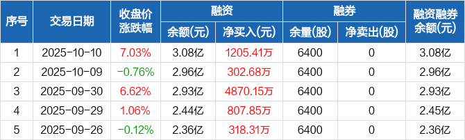 融资方面,当日融资买入6530.55万元,融资偿还5325.14万元,融资净买入1205.41万元,连续5日净买入累计7504.41万元。融券方面,融券卖出0股,融券偿还0股,融券余量6400股,融券余额6.24万元。融资融券余额合计3.08亿元。