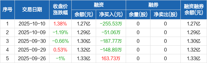 融资方面,当日融资买入408.75万元,融资偿还664.28万元,融资净偿还255.53万元,连续4日净偿还累计643.26万元。融券方面,融券卖出0股,融券偿还0股,融券余量0股,融券余额0元。融资融券余额合计1.27亿元。