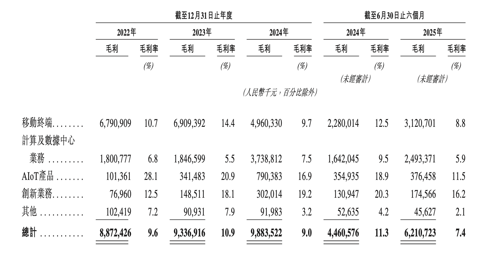 这一财务表现,揭示的是公司业务模式的困境:作为全球知名的智能产品ODM厂商,华勤技术难以摆脱低利润率的代工宿命。移动终端设备、计算及数据中心业务构成了公司收入的主要来源,但这两项业务的毛利率相对较低,且2025年上半年出现了普遍回落,其中移动终端毛利率仅8.8%,计算及数据中心业务更是只有5.9%;另外,高毛利的创新业务(汽车电子及工业)占比仍然较小。