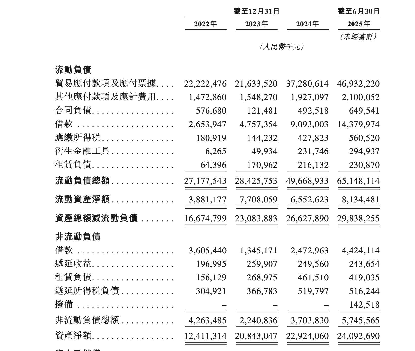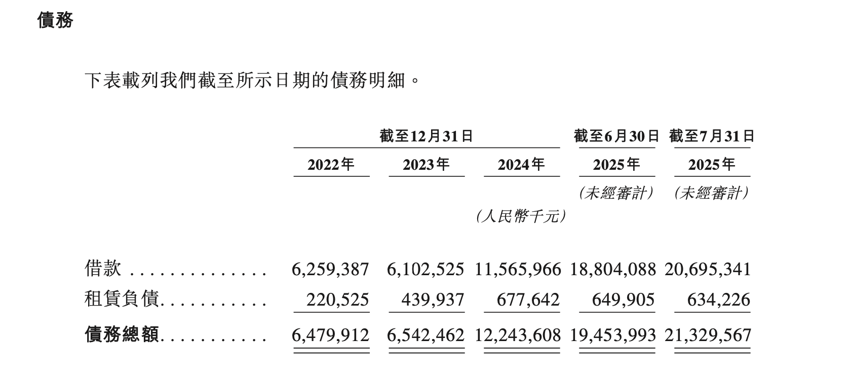 与此相应,公司负债也同样走高,贸易应付款项及应付票据从2023年的216.34亿元跃升至2024年的372.81亿元,2025年6月末增至469.32亿元。此外,有息负债更值得警惕:债务总额自2023年的65.42亿元几乎翻倍至2024年的122.44亿元,2025年6月末/7月末进一步升至194.54/206.95亿元。