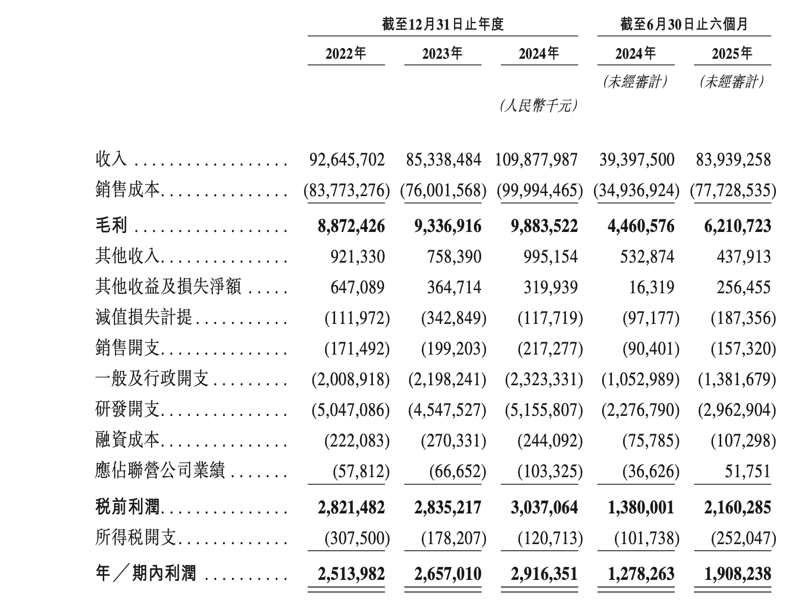 招股书显示,华勤技术近三年营业收入总体呈现增长趋势,2022年到2024年分别为926.46亿、853.38亿和1098.78亿元,2025年上半年更是达到839.39亿元,同比增长明显;毛利分别为88.72亿元、93.37亿元和98.84亿元,2025年上半年为62.11亿元。