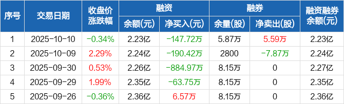 融资方面,当日融资买入1225.54万元,融资偿还1373.26万元,融资净偿还147.72万元,连续4日净偿还累计1286.86万元。融券方面,融券卖出5.59万股,融券偿还0股,融券余量5.87万股,融券余额33.93万元。融资融券余额合计2.23亿元。