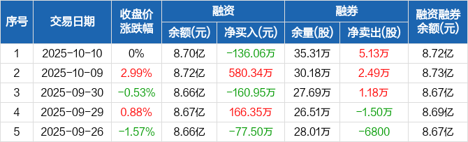 融资方面,当日融资买入377.2万元,融资偿还513.26万元,融资净偿还136.06万元。融券方面,融券卖出6.33万股,融券偿还1.2万股,融券余量35.31万股,融券余额206.56万元。融资融券余额合计8.72亿元。