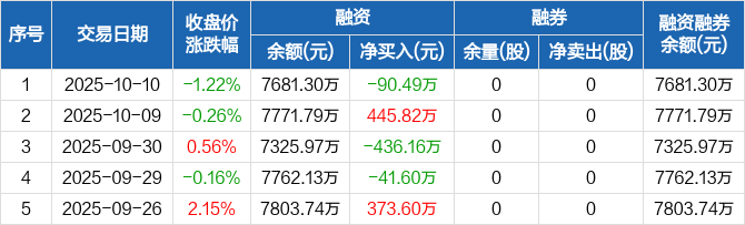 融资方面,当日融资买入439.88万元,融资偿还530.37万元,融资净偿还90.49万元。融券方面,融券卖出0股,融券偿还0股,融券余量0股,融券余额0元。融资融券余额合计7681.3万元。