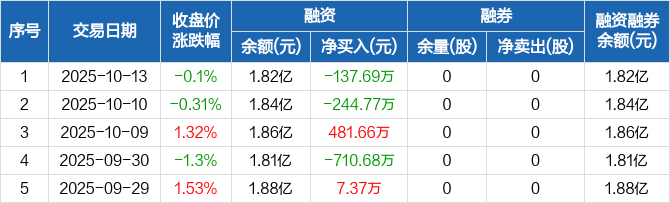 融资方面,当日融资买入343.97万元,融资偿还481.66万元,融资净偿还137.69万元。融券方面,融券卖出0股,融券偿还0股,融券余量0股,融券余额0元。融资融券余额合计1.82亿元。