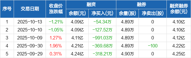 融资方面,当日融资买入964.34万元,融资偿还1018.68万元,融资净偿还54.34万元,连续9日净偿还累计3258.56万元。融券方面,融券卖出0股,融券偿还0股,融券余量4.89万股,融券余额95.67万元。融资融券余额合计4.1亿元。