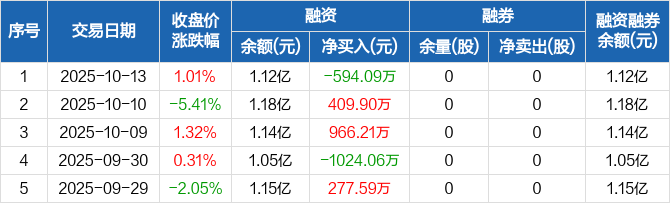 融资方面,当日融资买入944.85万元,融资偿还1538.94万元,融资净偿还594.09万元。融券方面,融券卖出0股,融券偿还0股,融券余量0股,融券余额0元。融资融券余额合计1.12亿元。