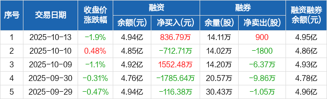 融资方面,当日融资买入2806.08万元,融资偿还1969.28万元,融资净买入836.79万元。融券方面,融券卖出1300股,融券偿还400股,融券余量14.11万股,融券余额87.34万元。融资融券余额合计4.95亿元。
