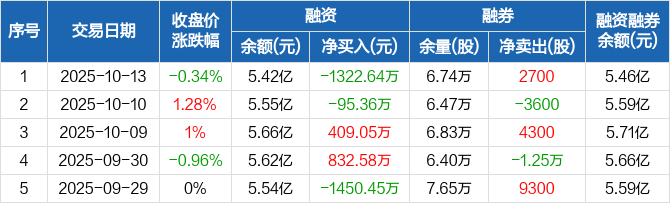 融资方面,当日融资买入1993.45万元,融资偿还3316.09万元,融资净偿还1322.64万元。融券方面,融券卖出4900股,融券偿还2200股,融券余量6.74万股,融券余额452.93万元。融资融券余额合计5.46亿元。