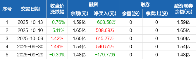 融资方面,当日融资买入1607.89万元,融资偿还2216.47万元,融资净偿还608.58万元。融券方面,融券卖出0股,融券偿还0股,融券余量0股,融券余额0元。融资融券余额合计1.59亿元。