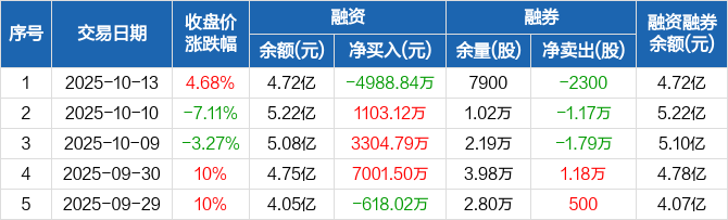 融资方面,当日融资买入5749.59万元,融资偿还1.07亿元,融资净偿还4988.84万元。融券方面,融券卖出2400股,融券偿还4700股,融券余量7900股,融券余额48.62万元。融资融券余额合计4.72亿元。
